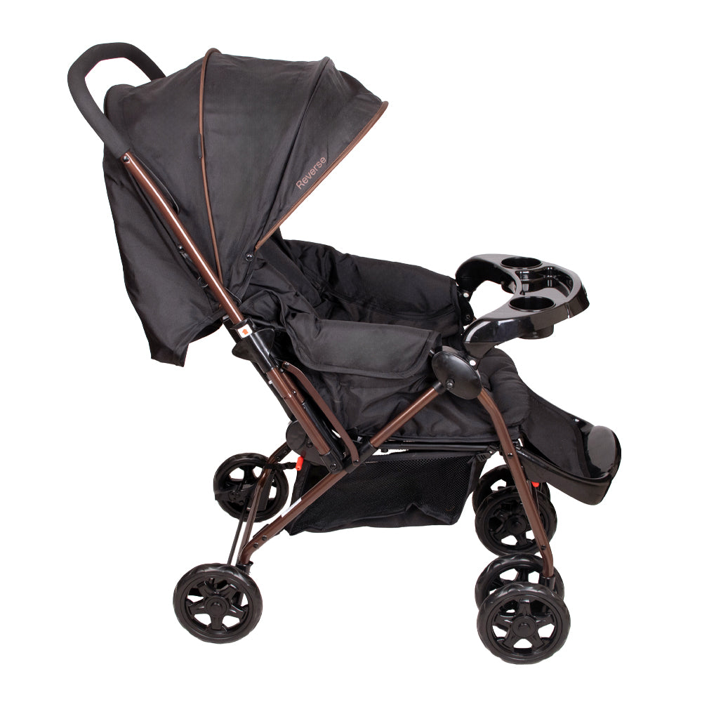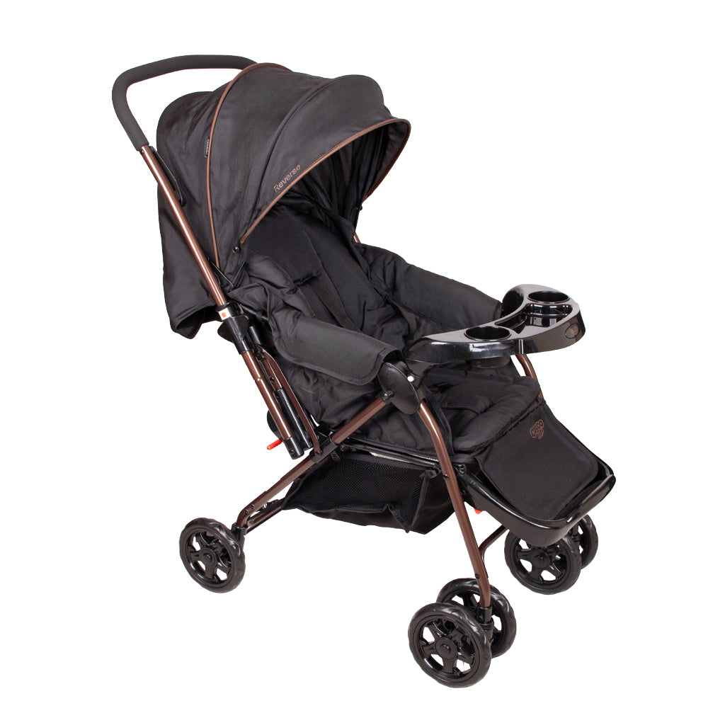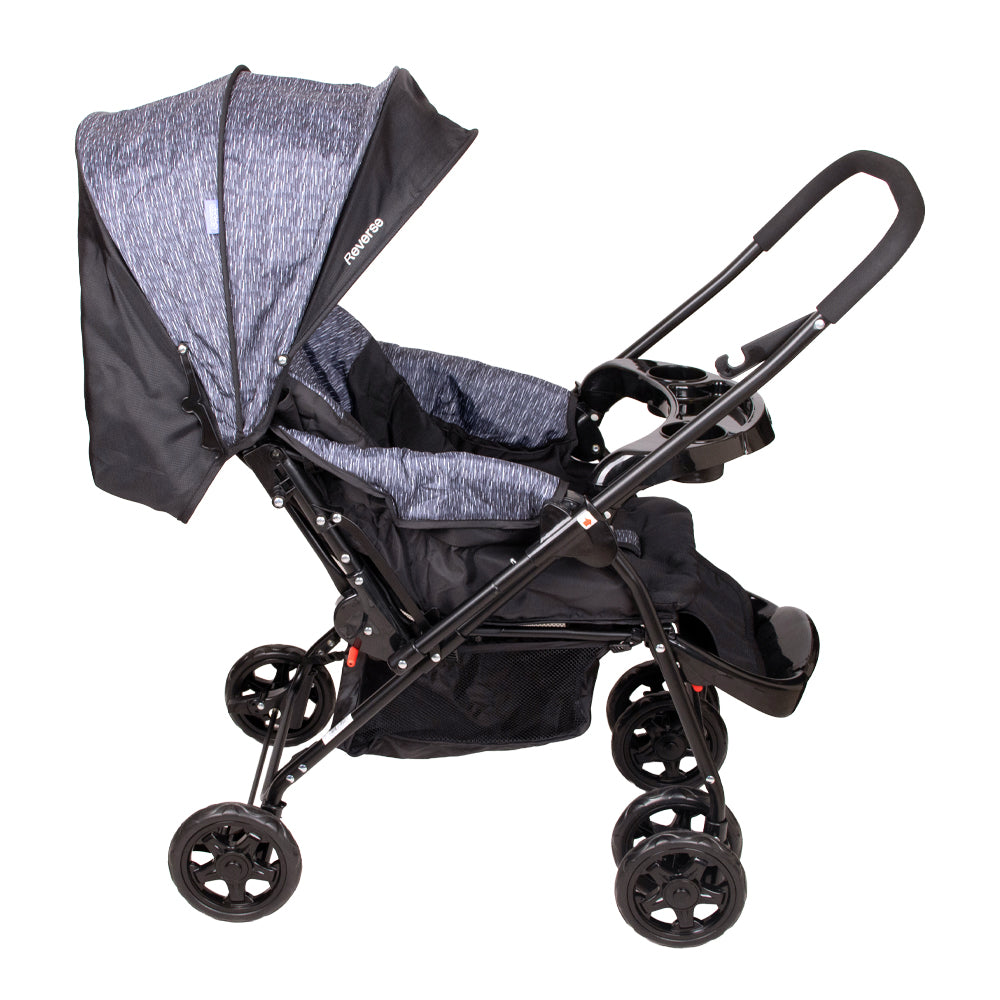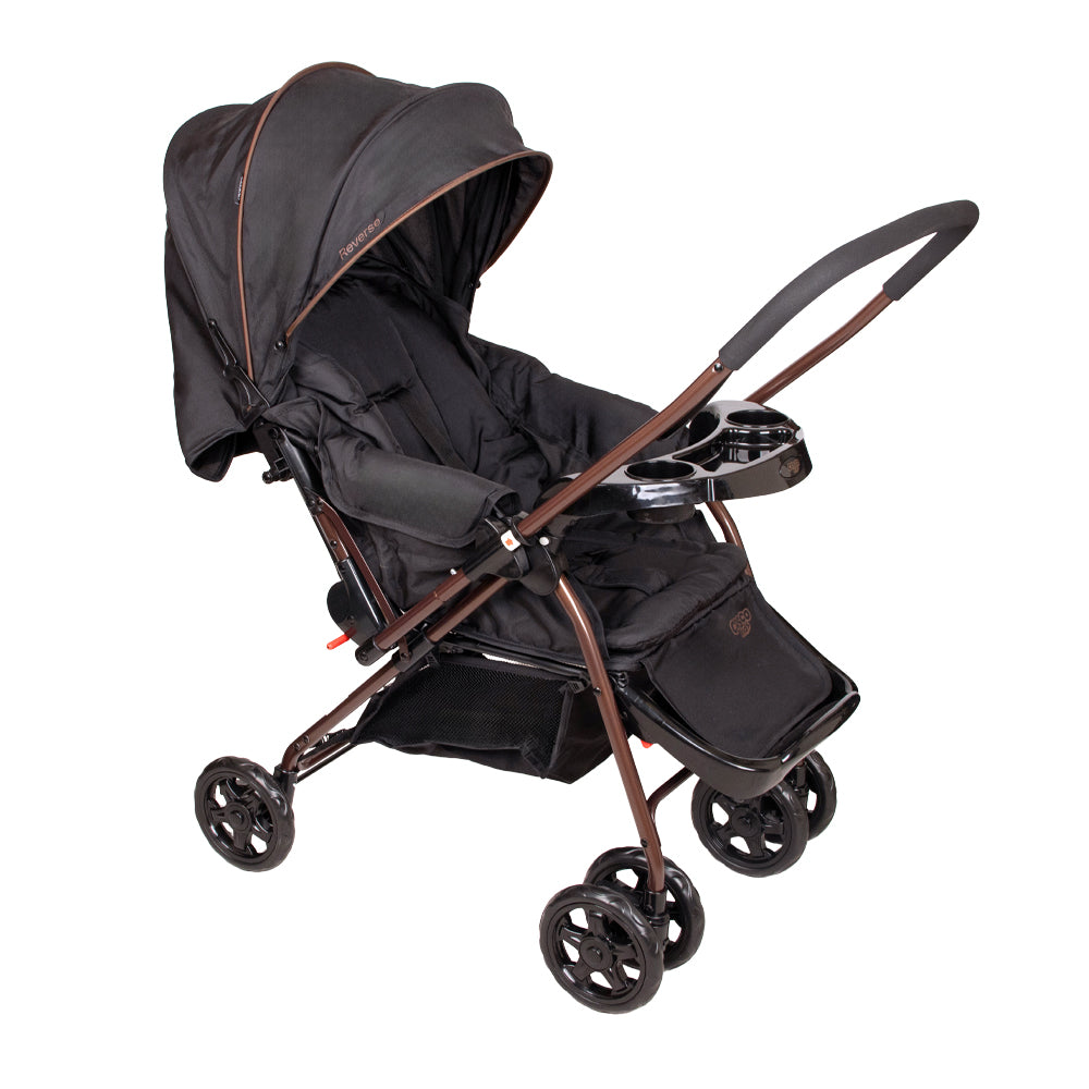 El coche reverse incluye un colchón suave, una capota amplia y ajustable con bolsillo para guardar objetos pequeños, y una bandeja frontal extraíble con portavasos.