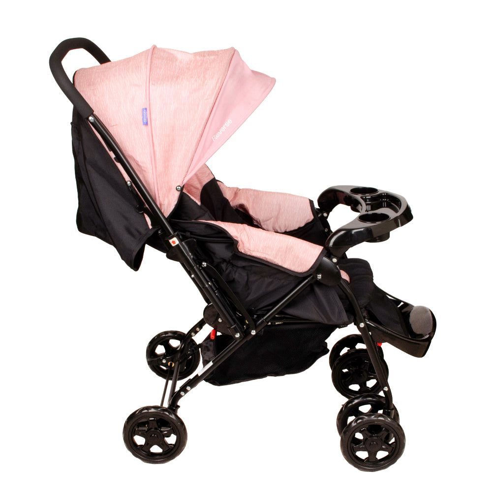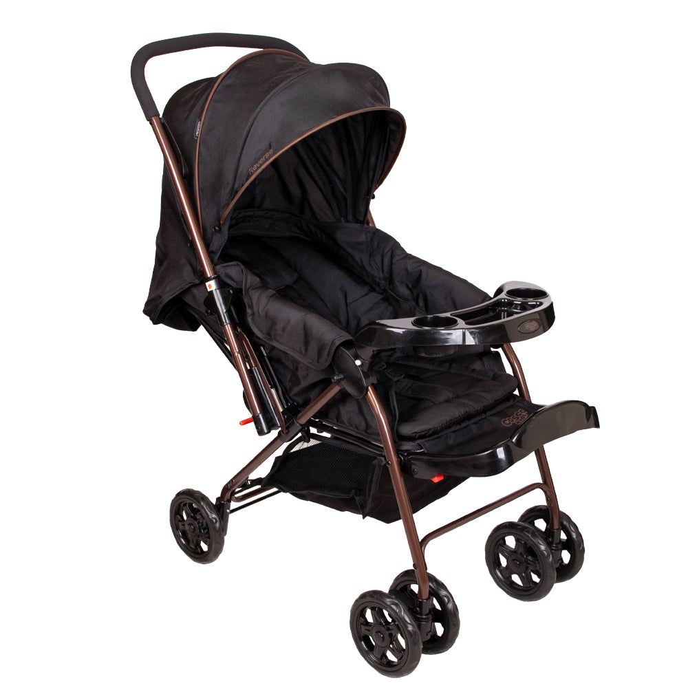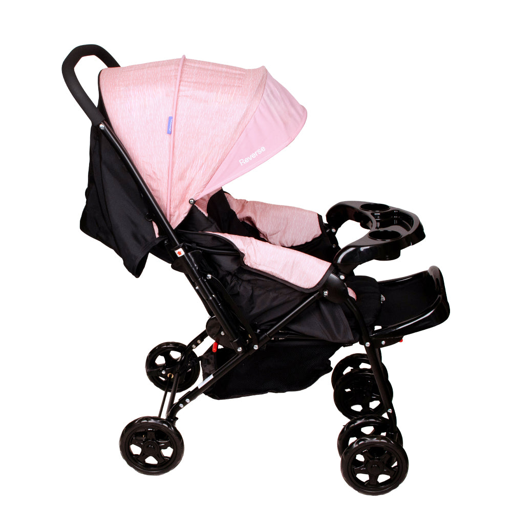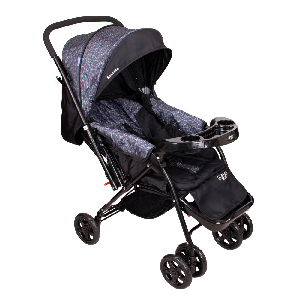 El coche reverse incluye un colchón suave, una capota amplia y ajustable con bolsillo para guardar objetos pequeños, y una bandeja frontal extraíble con portavasos.