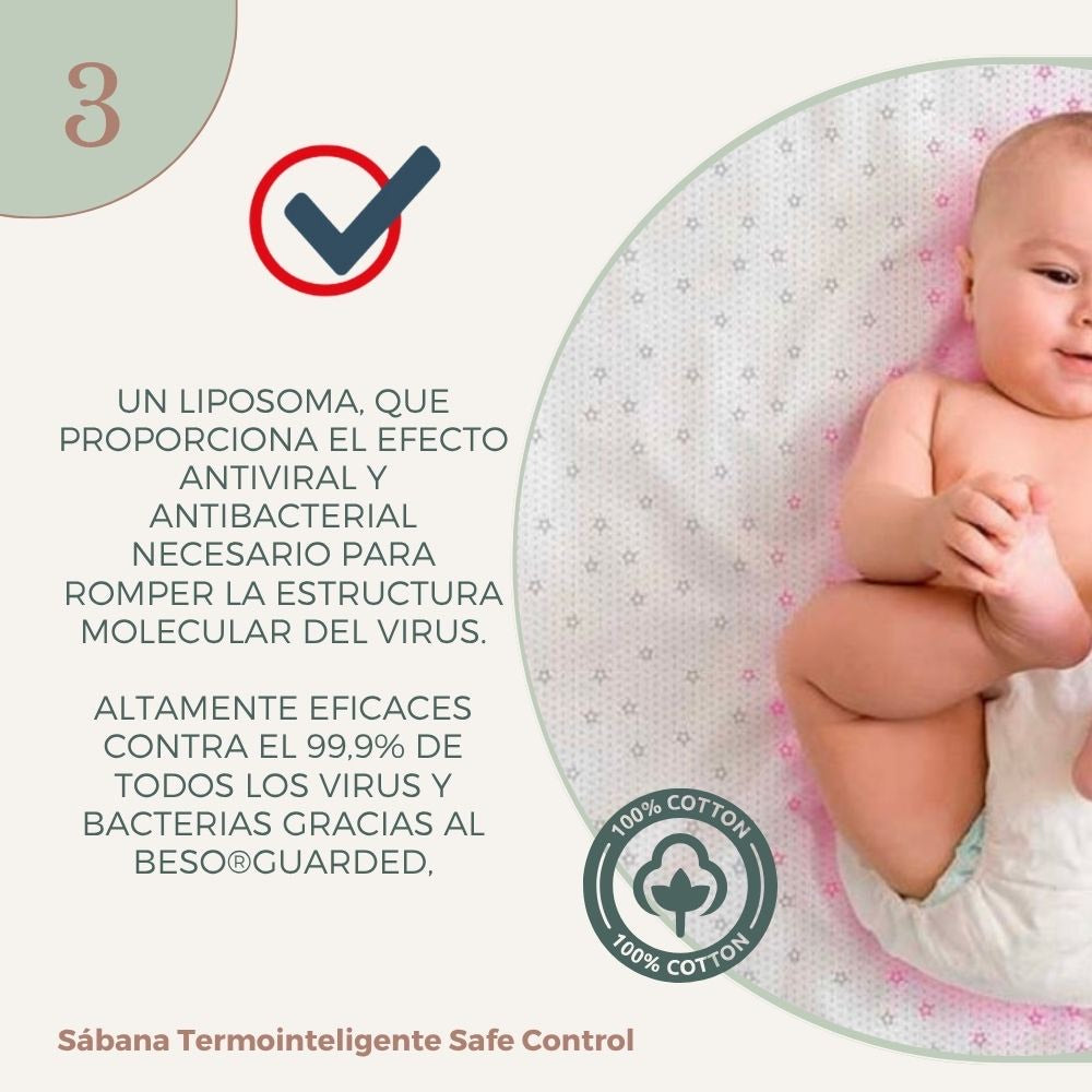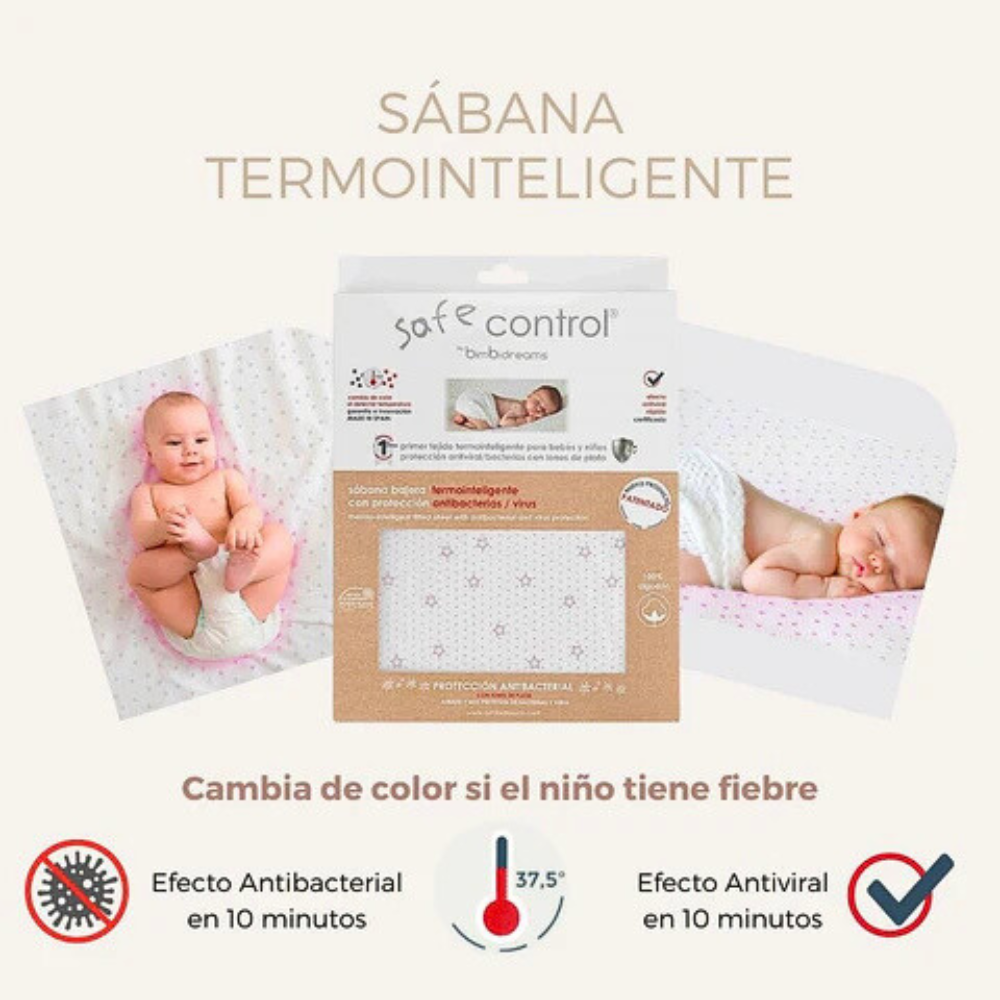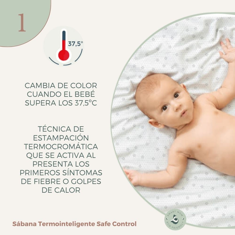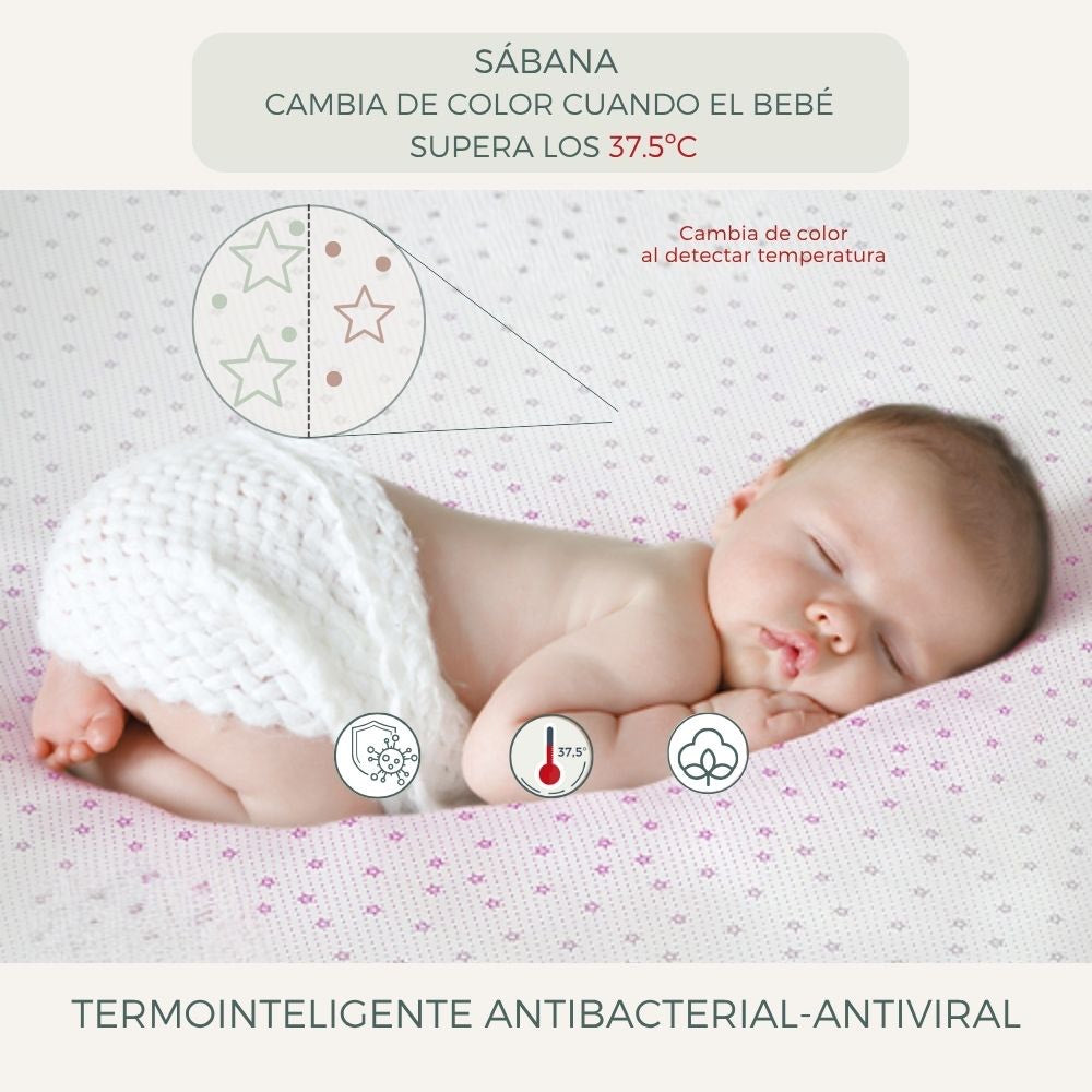 Esta sábana bajera funciona como cubre colchón impermeable y, además, cambia de color al detectar fiebre o golpes de calor, gracias a su tecnología termo cromática Safe Control®, activándose a partir de los 37,5 °C. El color pasa de gris a un tono rosado, permitiéndote actuar con rapidez y sin interrumpir el sueño de tu guagua.