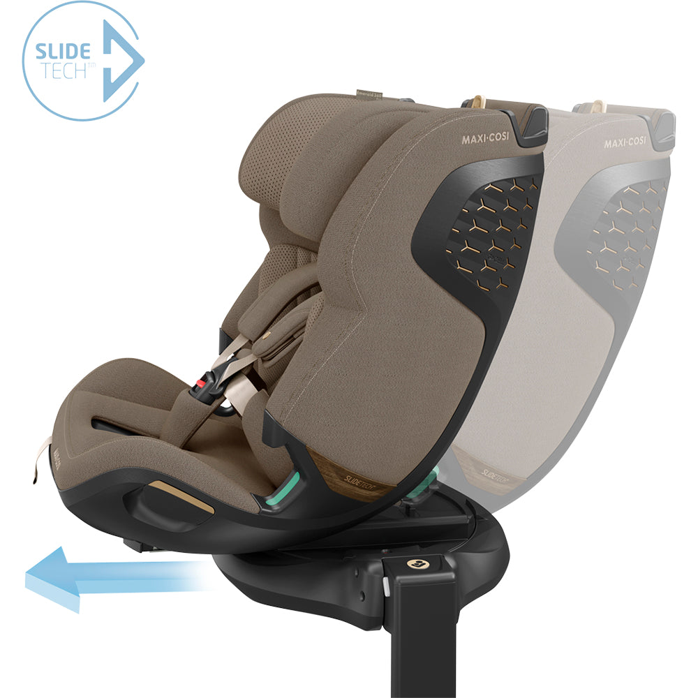 Su innovadora rotación 360° junto a la tecnología SlideTech® permite deslizar la silla hasta 17 cm, facilitando el acceso y la correcta instalación del bebé sin forzar la espalda de los padres.