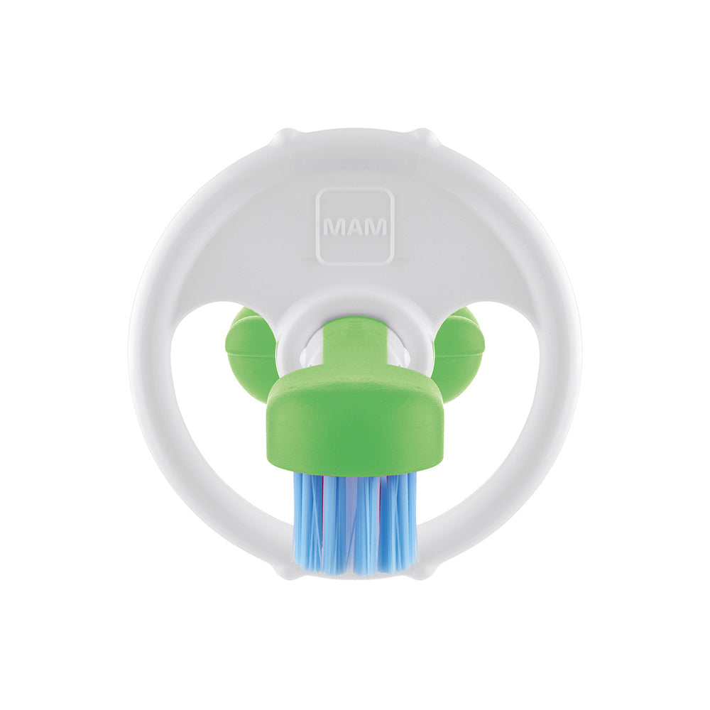 Sus cerdas suaves en la parte delantera cuidan de la delicada boca del bebé, mientras que las diferentes estructuras de masaje en los lados y en la parte posterior del cabezal estimulan suavemente las encías, aliviando las molestias durante la dentición y ayudando a eliminar la placa y las bacterias. La cabeza redondeada, fabricada con material especialmente suave, protege las encías, labios y mejillas del bebé.