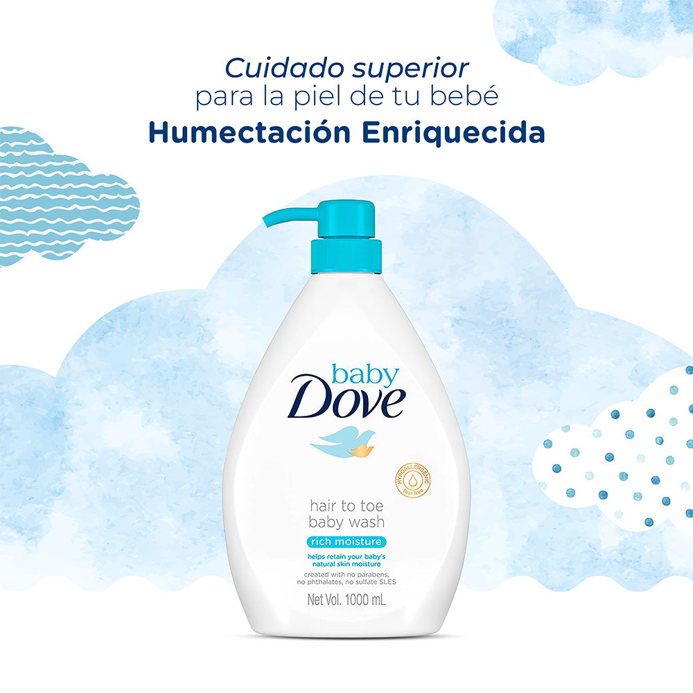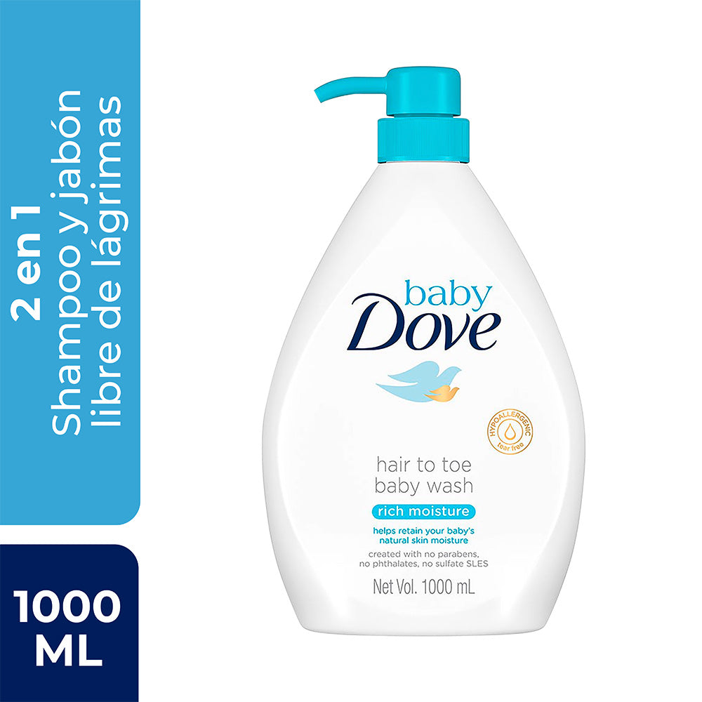 Descubre el Gel de Baño 2 en 1 Rich de Baby Dove 1L, shampoo y jabón con pH neutro y fórmula libre de lágrimas. Brinda hidratación y cuidado superior desde recién nacido.