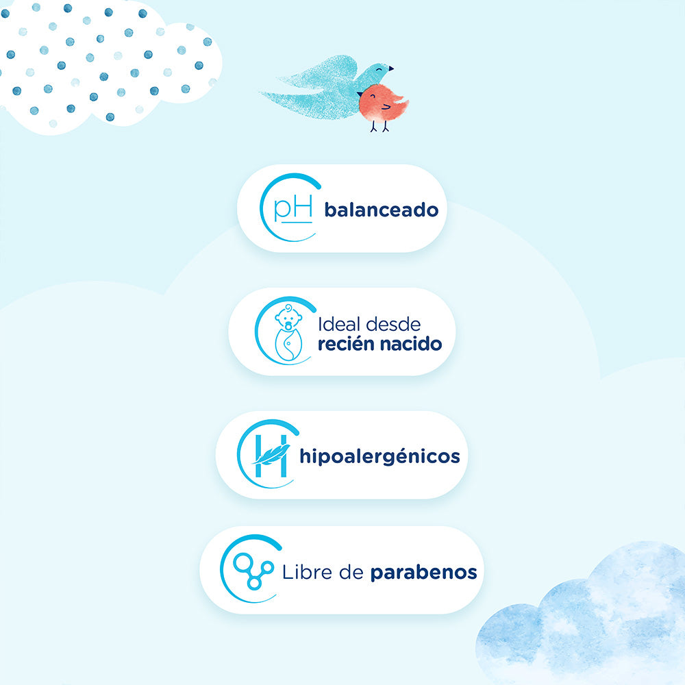 Modo de uso: Aplica sobre la piel y el cabello húmedos del bebé. Masajea suavemente hasta formar espuma y enjuaga con agua tibia. Apto para uso diario desde recién nacido.