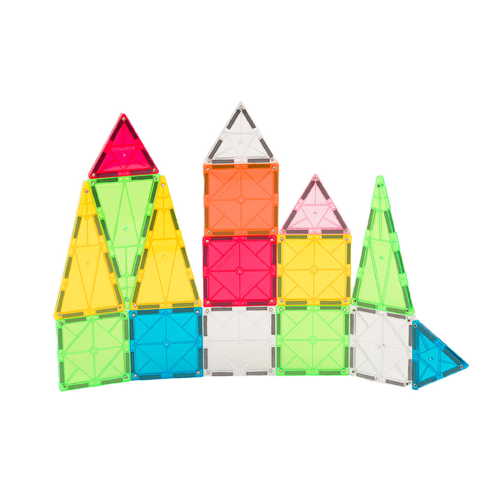 Sus piezas geométricas, seguras y translúcidas, invitan a crear figuras en 2D y 3D, desarrollando la creatividad, la coordinación motriz y el pensamiento lógico de manera natural y divertida.